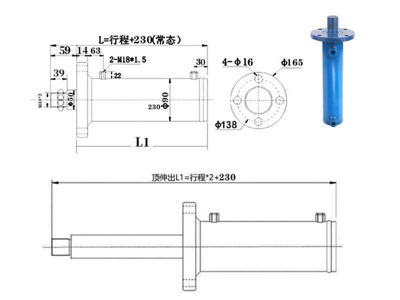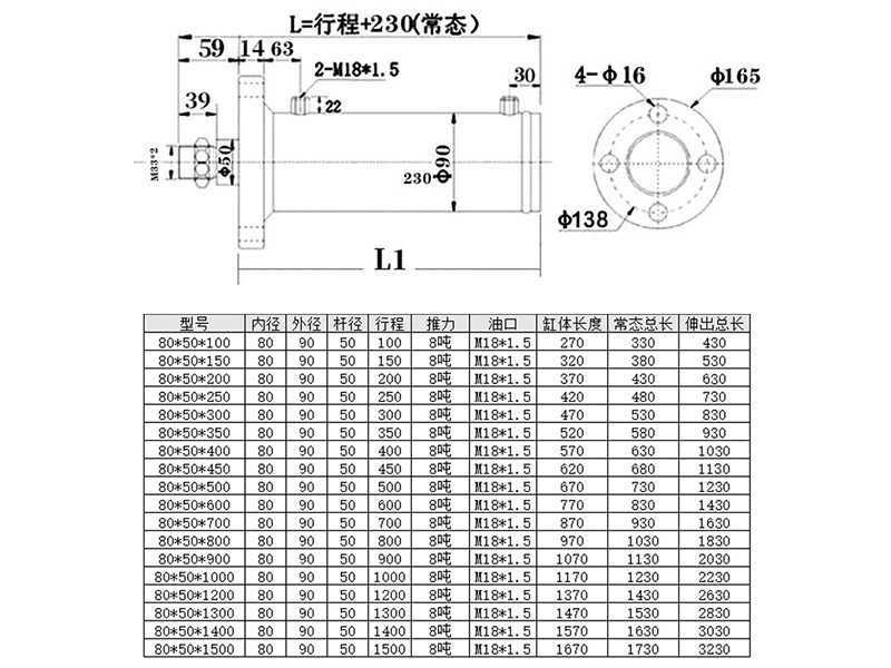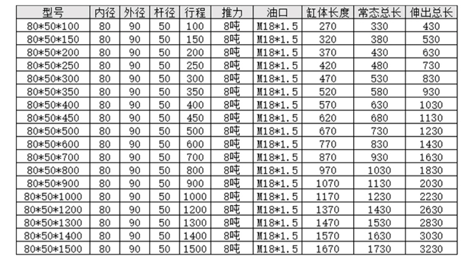 缸径80MM,杆径50MM,外径92MM,行程100~2000MM;螺纹M20*1.5,额定耐压16MPA,ZUI高19MPA,推力可达8吨;