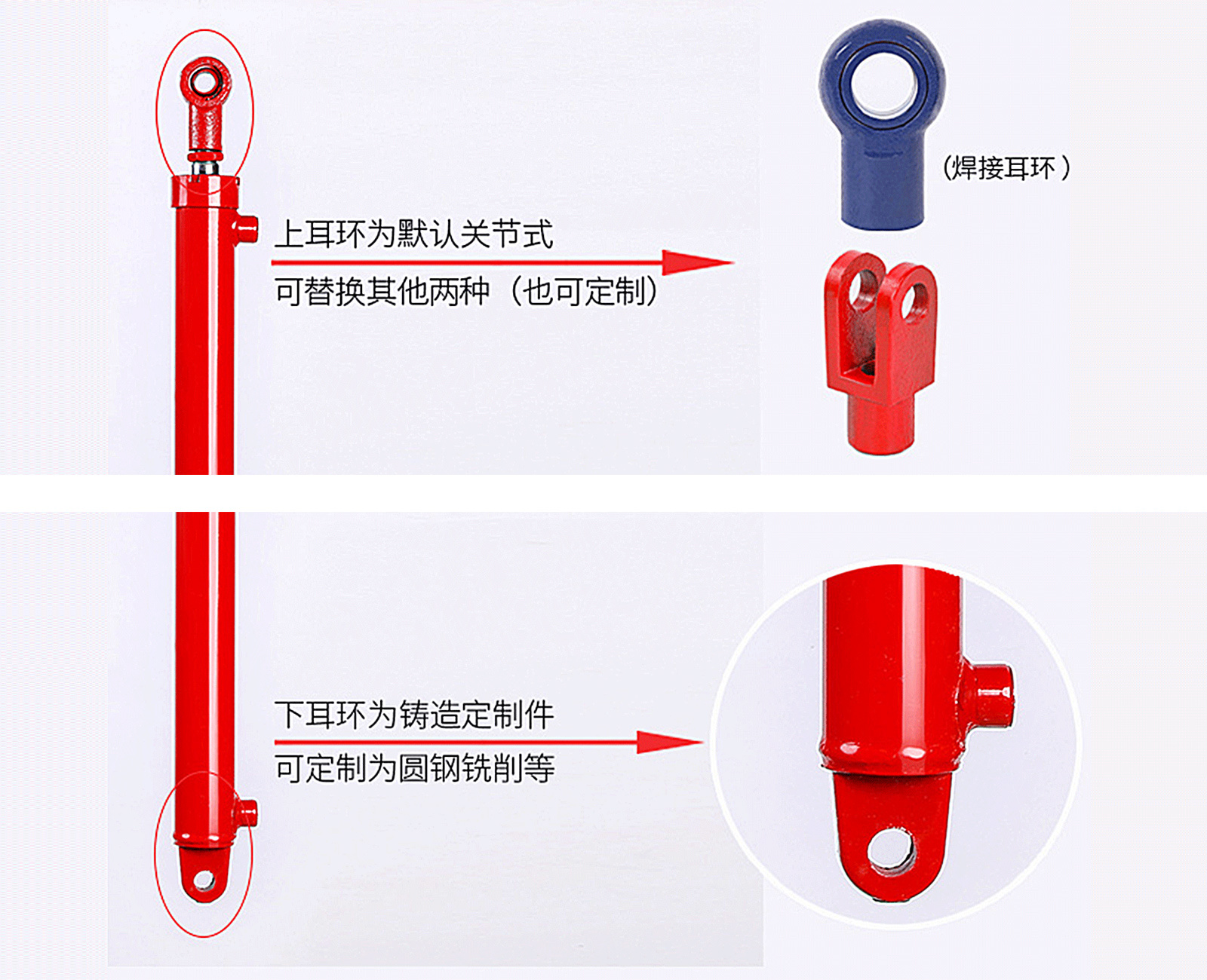 采用45#硬钢,电镀活塞杆,厚度2丝,两端穿销孔设计; 聚氨脂优质密封圈,万向轴承,自动焊接不漏油更耐用。