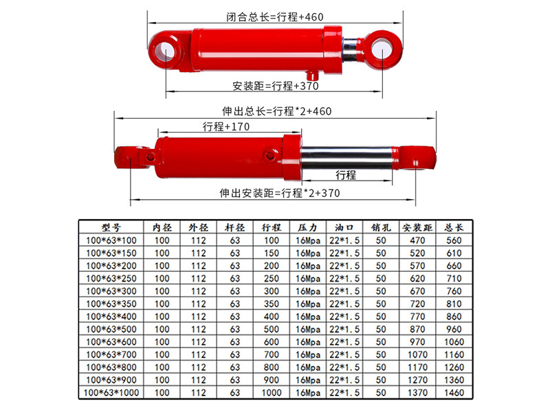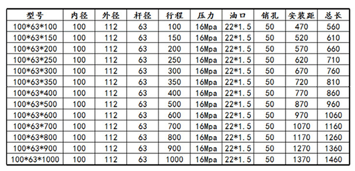 缸径100MM,杆径63MM ,外径11OMM,行程100~2000MM;螺纹M20*1.5,额定耐压16MPA,ZUI高19MPA,额定推力12.5吨;详见下图尺寸,部分规格支持定做,请咨询公司客服人员。