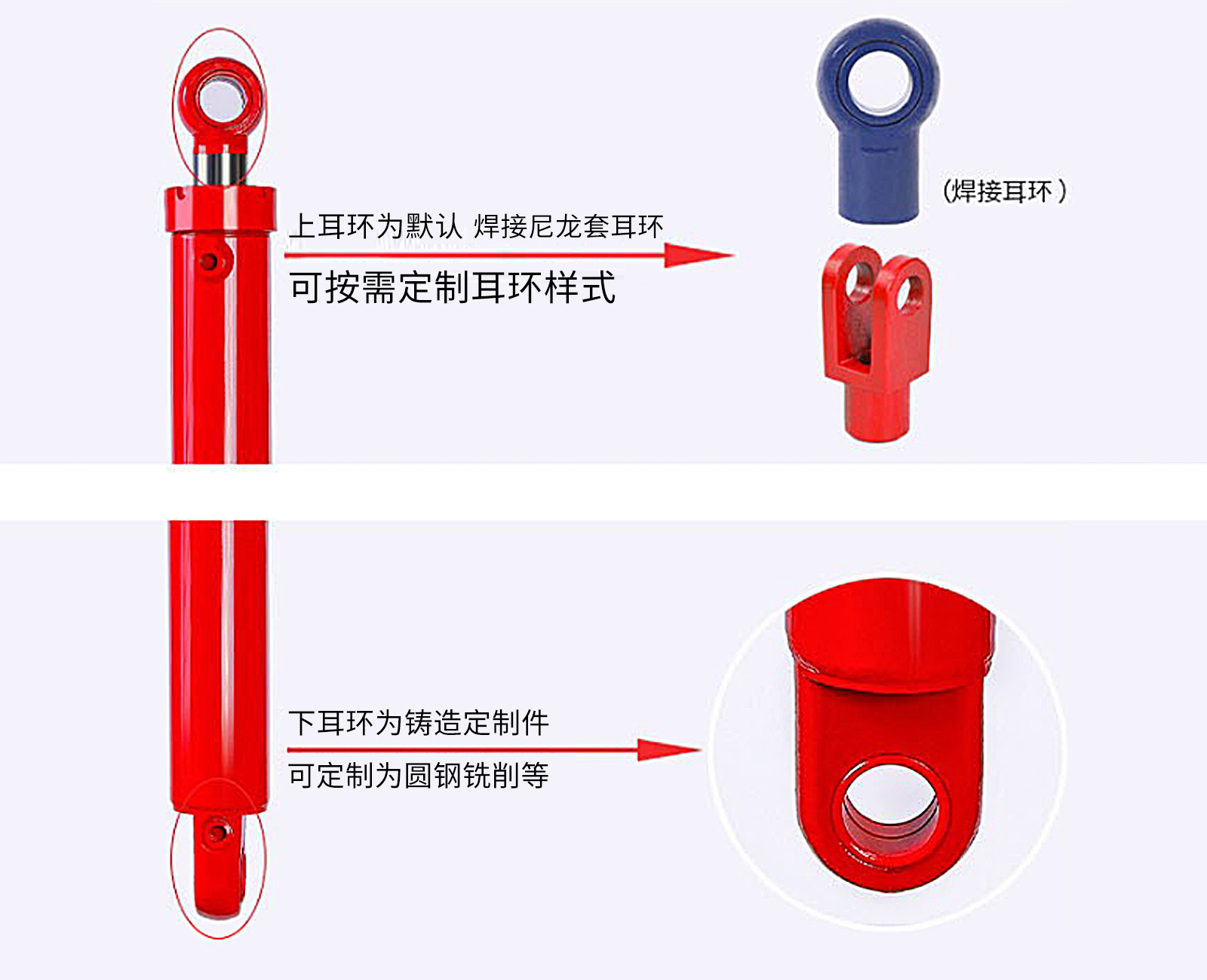 采用45#硬钢,电镀活塞杆,厚度2丝,两端穿销孔设计; 聚氨脂优质密封圈,万向轴承,自动焊接不漏油更耐用。